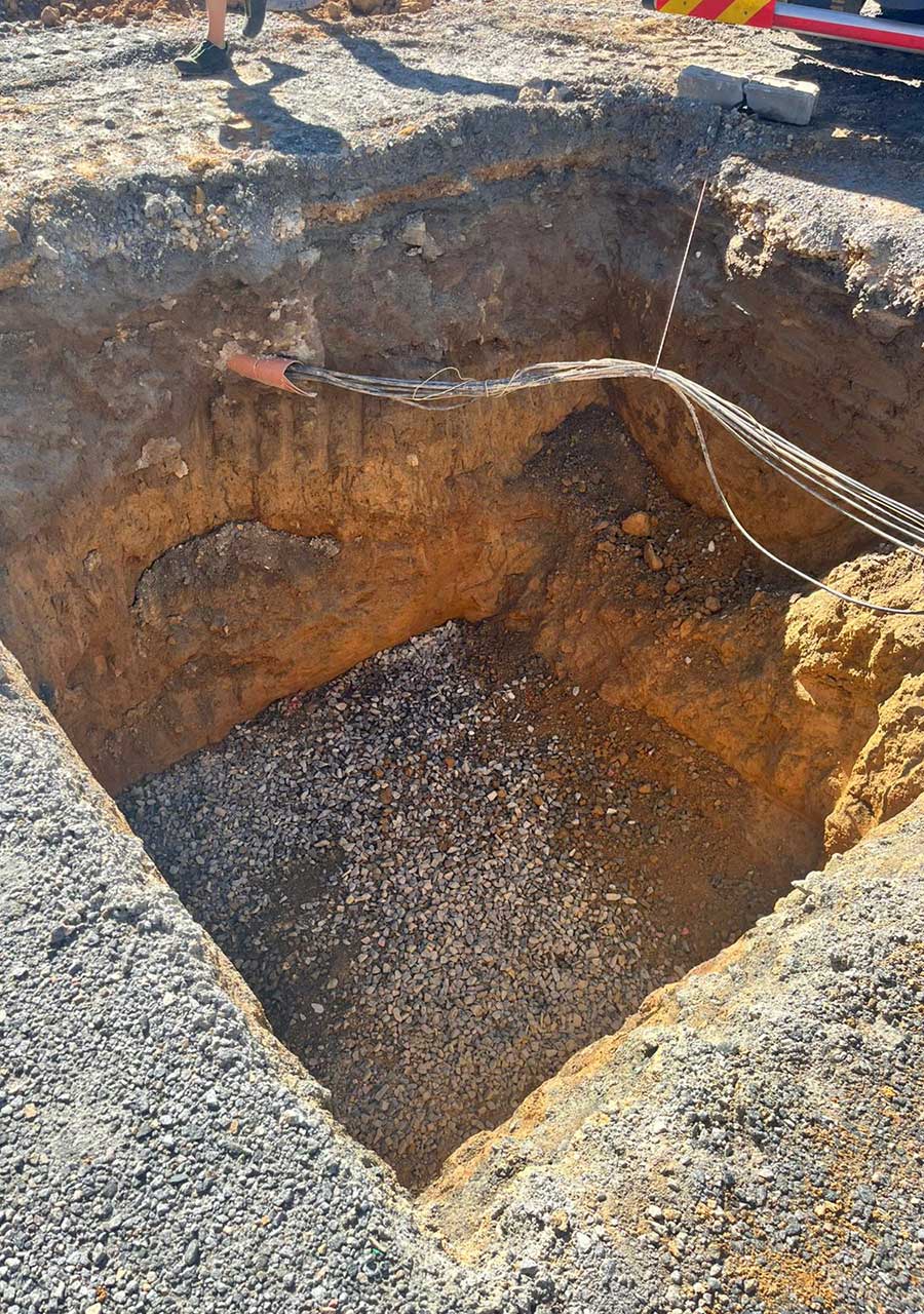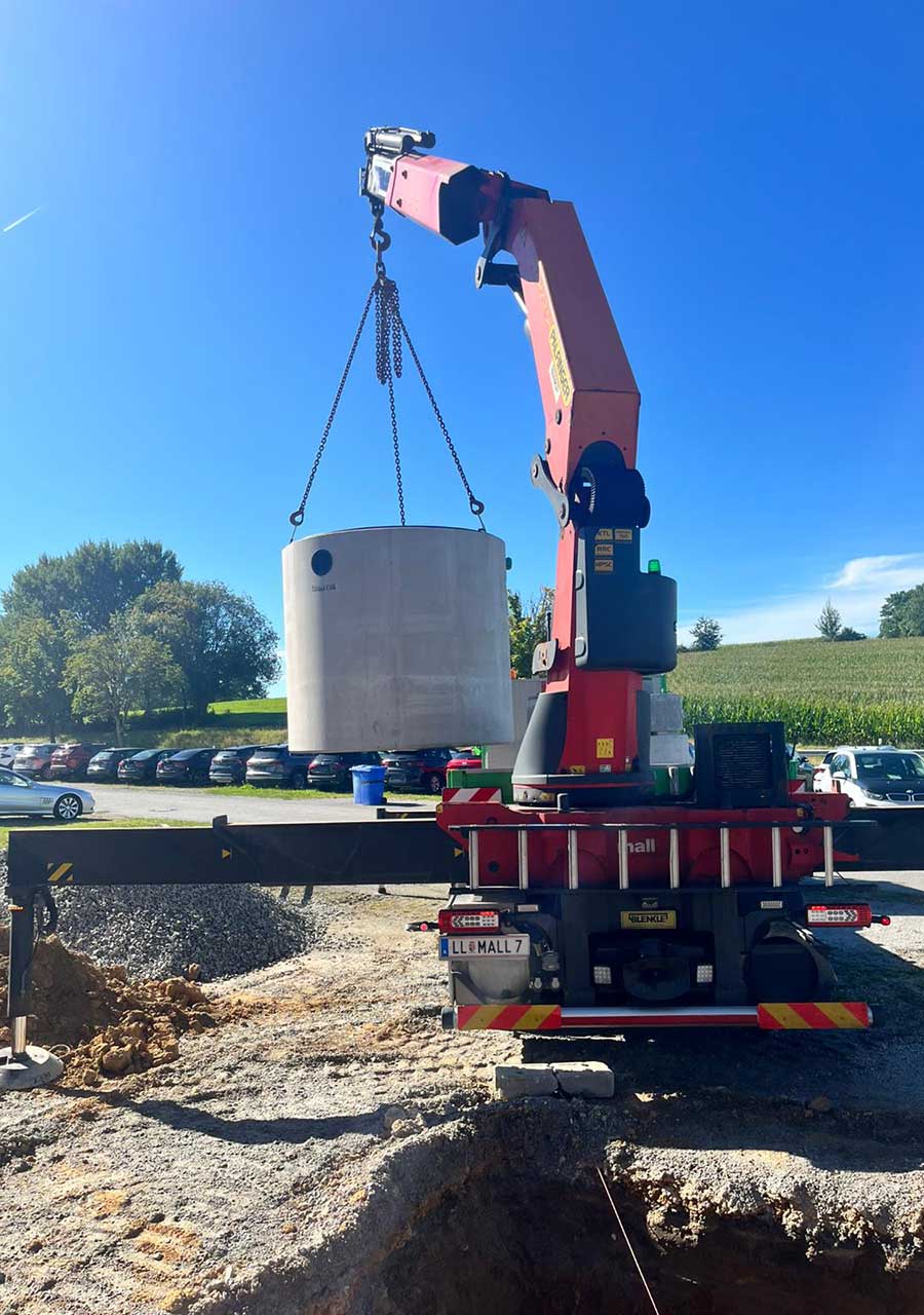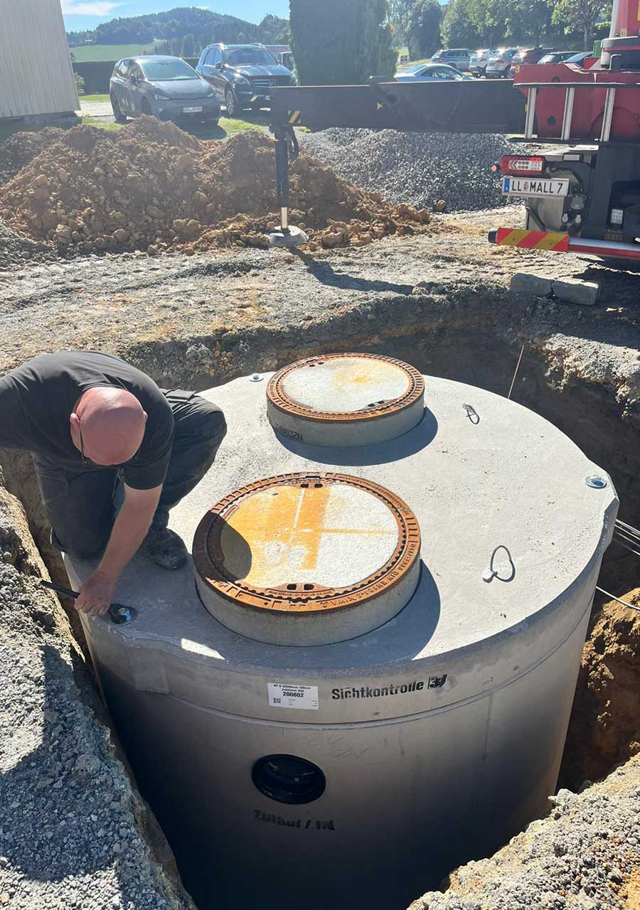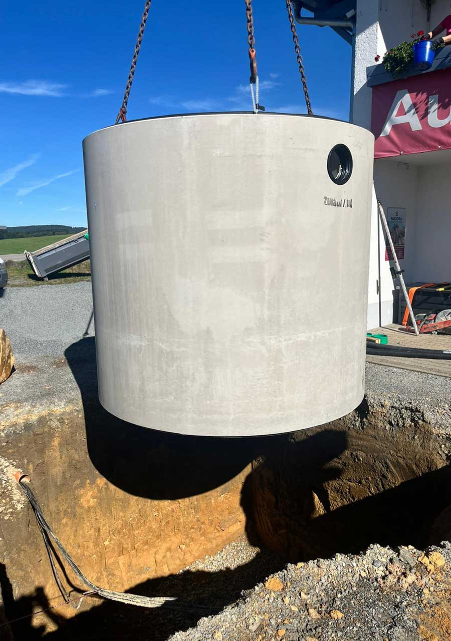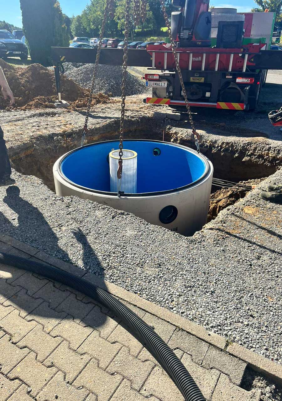 Ölabscheider wird in der Baugrube so eingesetzt dass Ablauf und Zulauf einfach angeschlossen werden können