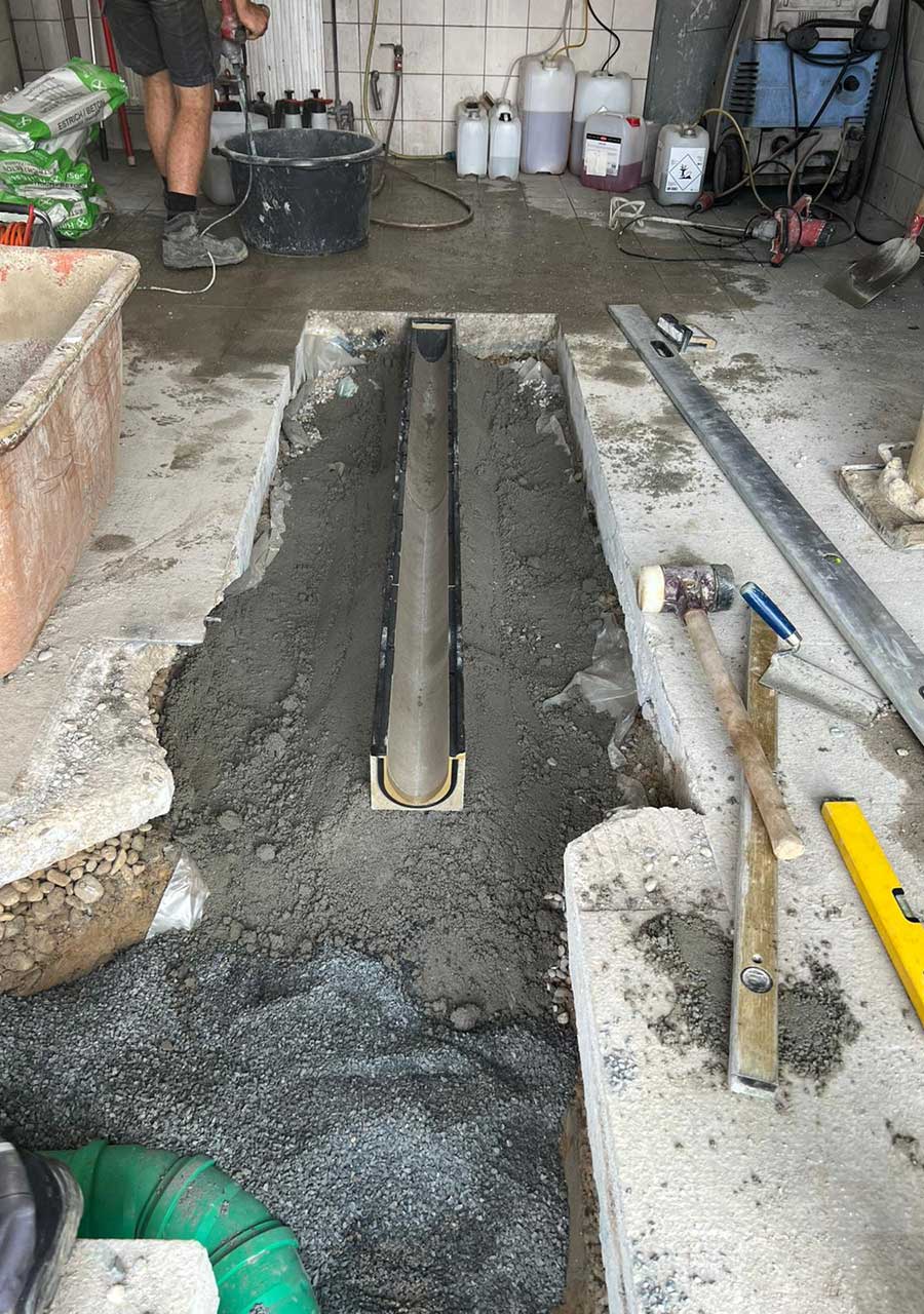 In vorliegender Konstellation wird ein alter schadhafter Ölabscheider durch einen neuen Ölabscheider der Fa. Mall (Nenngröße 15) ersetzt. Durch die aktuelle Nutzung der Waschhalle war zudem die Dimensionierung des bestehenden Ölabscheiders nicht mehr ausreichend. Im Zuge der Bauarbeiten hat es sich angeboten, auch den Ablauf (Rinne) in der Waschhalle zu erneuern.
