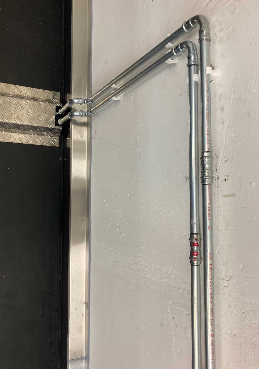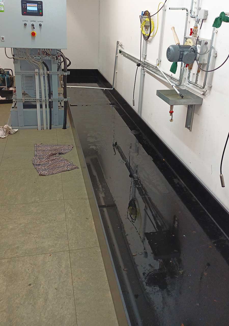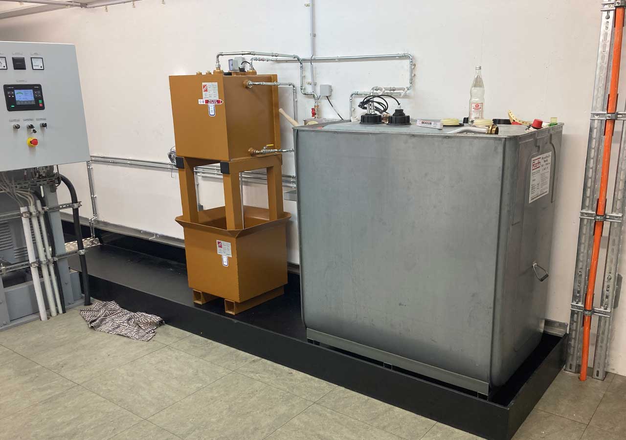 In vorliegender Installation war eine Anlage zur Notstromerzeugung, bestehend aus einem Diesel Vorratstank (1000 Liter), einem Tagesbehälter (ca. 100 Liter Diesel) , dem Notstromaggregat (Dieselmotor und Generator) inkl. deren Verbindungsleitungen (Vorlauf und Rücklauf) nachzurüsten. Als günstigste Lösung wurde für diese für die Nachrüsten eine maßgefertigte WHG-Wanne (hier aus PE) inkl. Überwachung des Auffangraums durch ein Warngerät (Öl Sensor) gewählt.