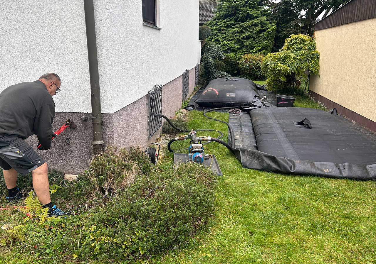 • In vorliegendem Fall wurde eine Tankraumfolie gewählt. D. h. der Tank vom Montageteam geleert damit er später angehoben werden kann. Die Zwischenlagerung Ihres Heizöls erfolgt in Blasen. Im Anschluss werden die Verbindungsleitungen werden getrennt und der Tank angehoben. Das Team bringt dann nach und nach eine vorkonfektionierte Tankraumfolie unter den Tank. Die Folie wird durch einen Vliesstoff von unten geschützt. Anschließend bringen die Monteure die Bahnen für die Seitenwände (Höhe entsprechend der Volumenberechnung, nach dem Tankvolumen) ein. Die Seitenwände werden mit Leisten auf der entsprechenden Höhe fixiert und unten mit der Bodenfolie mit einem zertifizierten Verfahren verschweißt. Der Einbau erfolgt innerhalb eines Tages. Auf Wunsch legen Ihnen unsere Monteure eine Notversorgung für Ihren Heizbrenner, sodass Sie durchgehend über warmes Wasser und Ihre Heizung verfügen können.