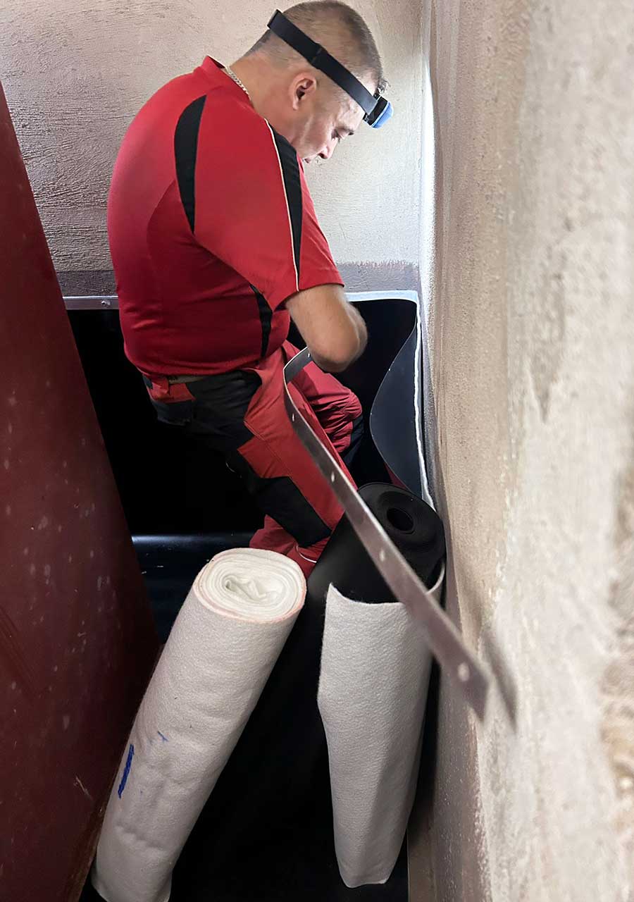 Monteur bei der Fixierung der Seitenbahnen (Tankraumfolie) über eine Aluleiste