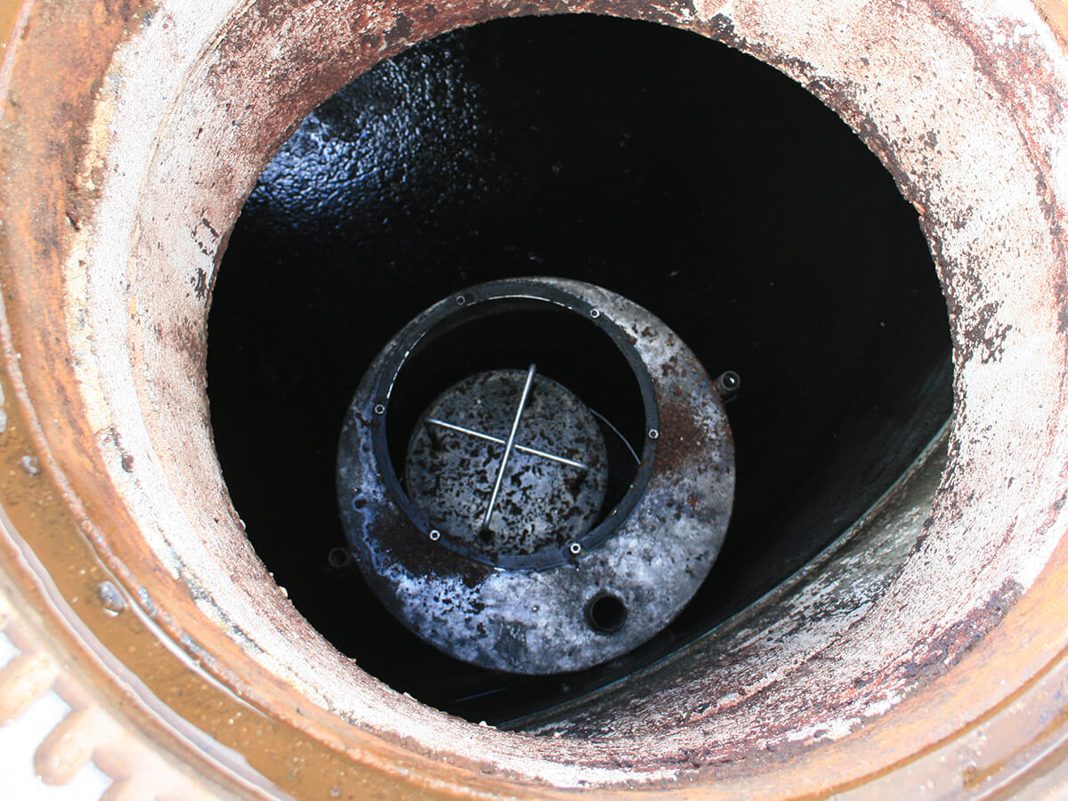 Blick auf den Schwimmer am Ablauf der Leichtflüssigkeitsabscheideanlage, vor der Entleerung/Reinigung