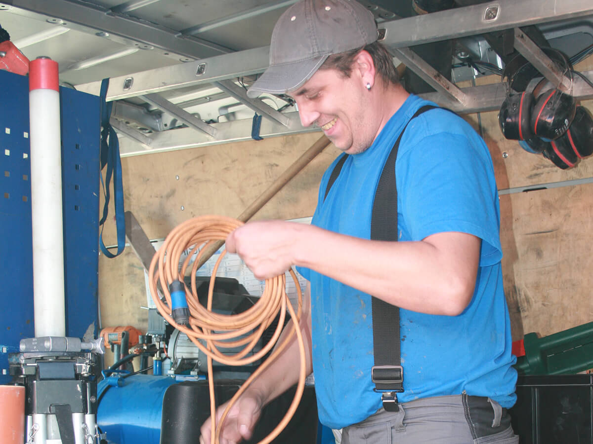 Monteur beim Aufbau der Messapparatur für die Dichtprüfung