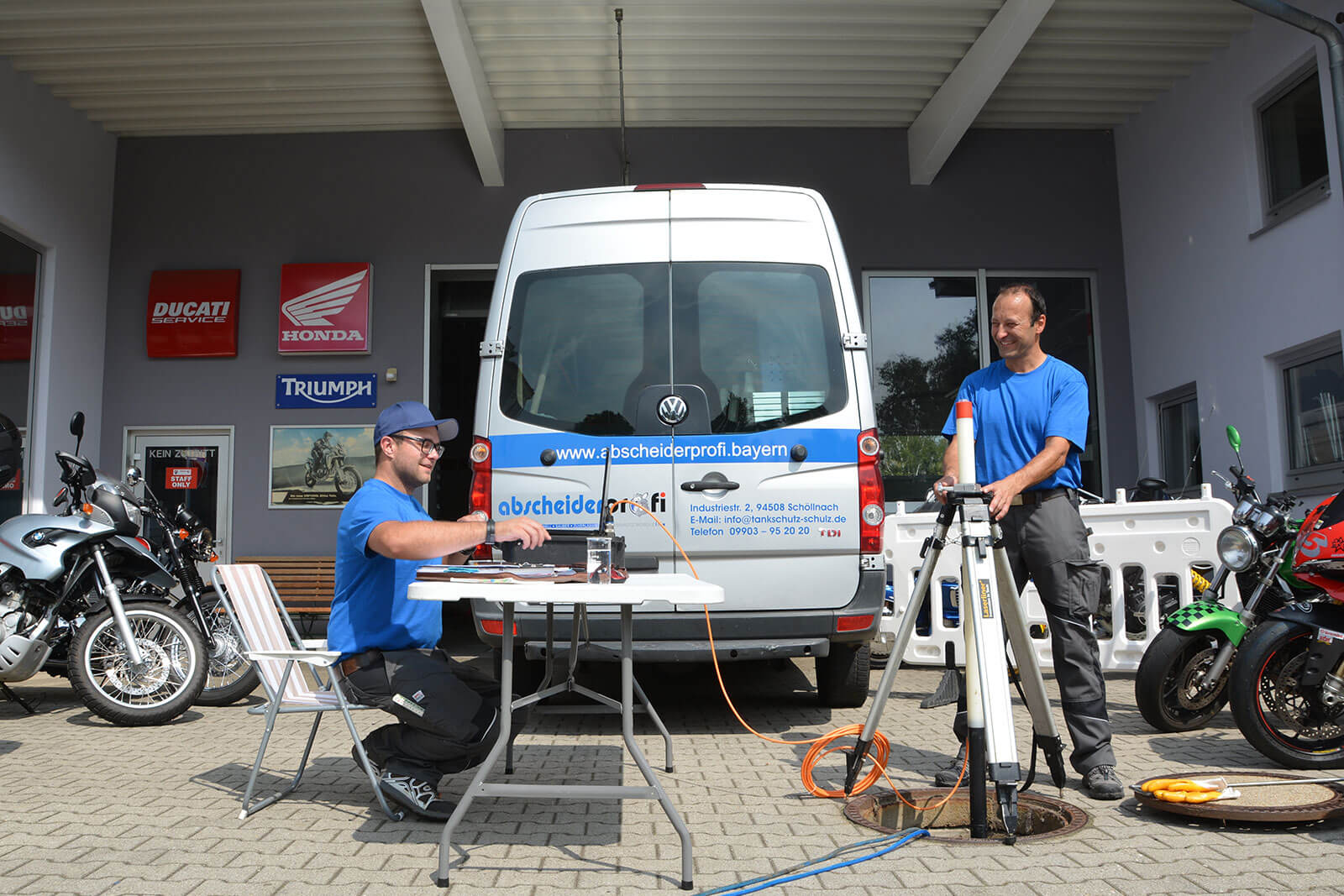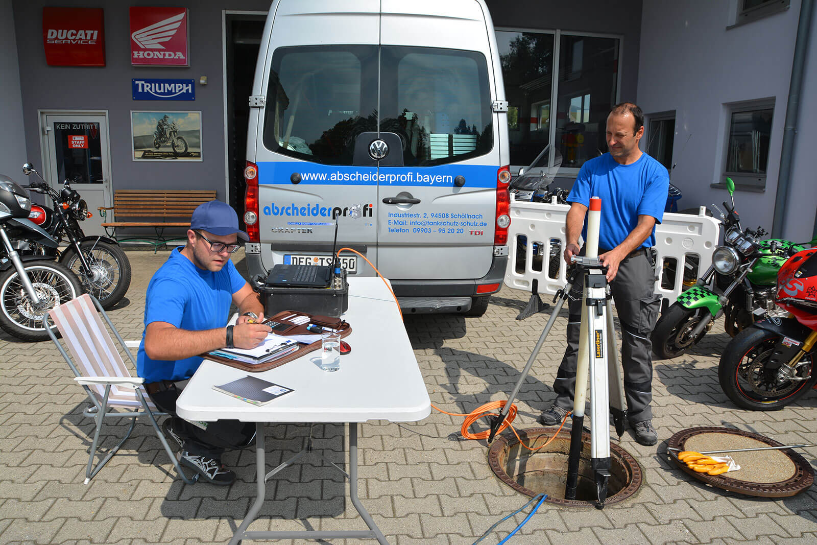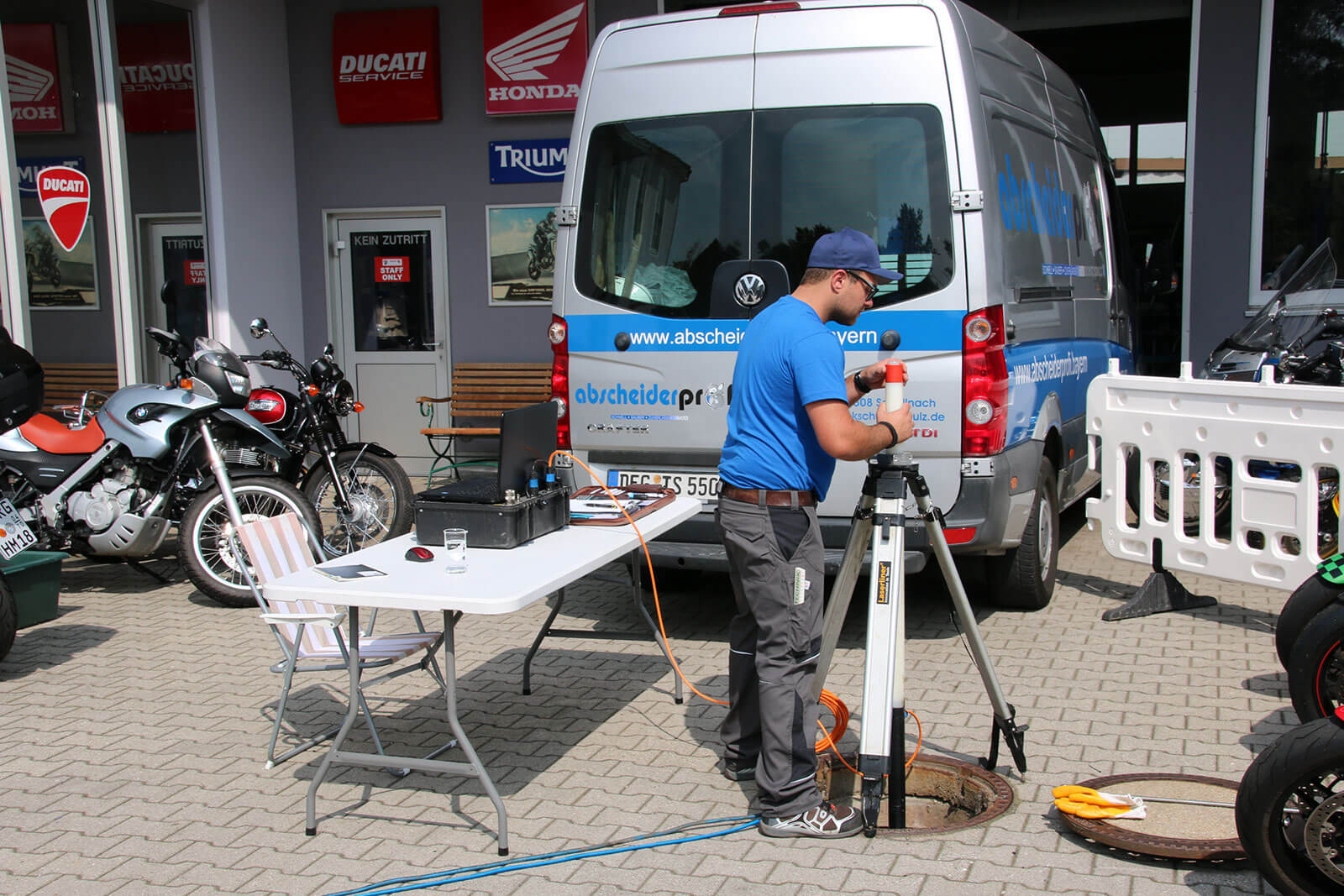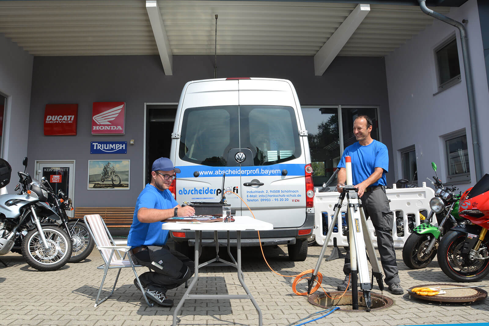 Hier: Serviceteam bei der Durchführung einer Generalinspektion des Leichtflüssigkeitsabscheiders/ Ölabscheiders einer Motorradwerkstatt.