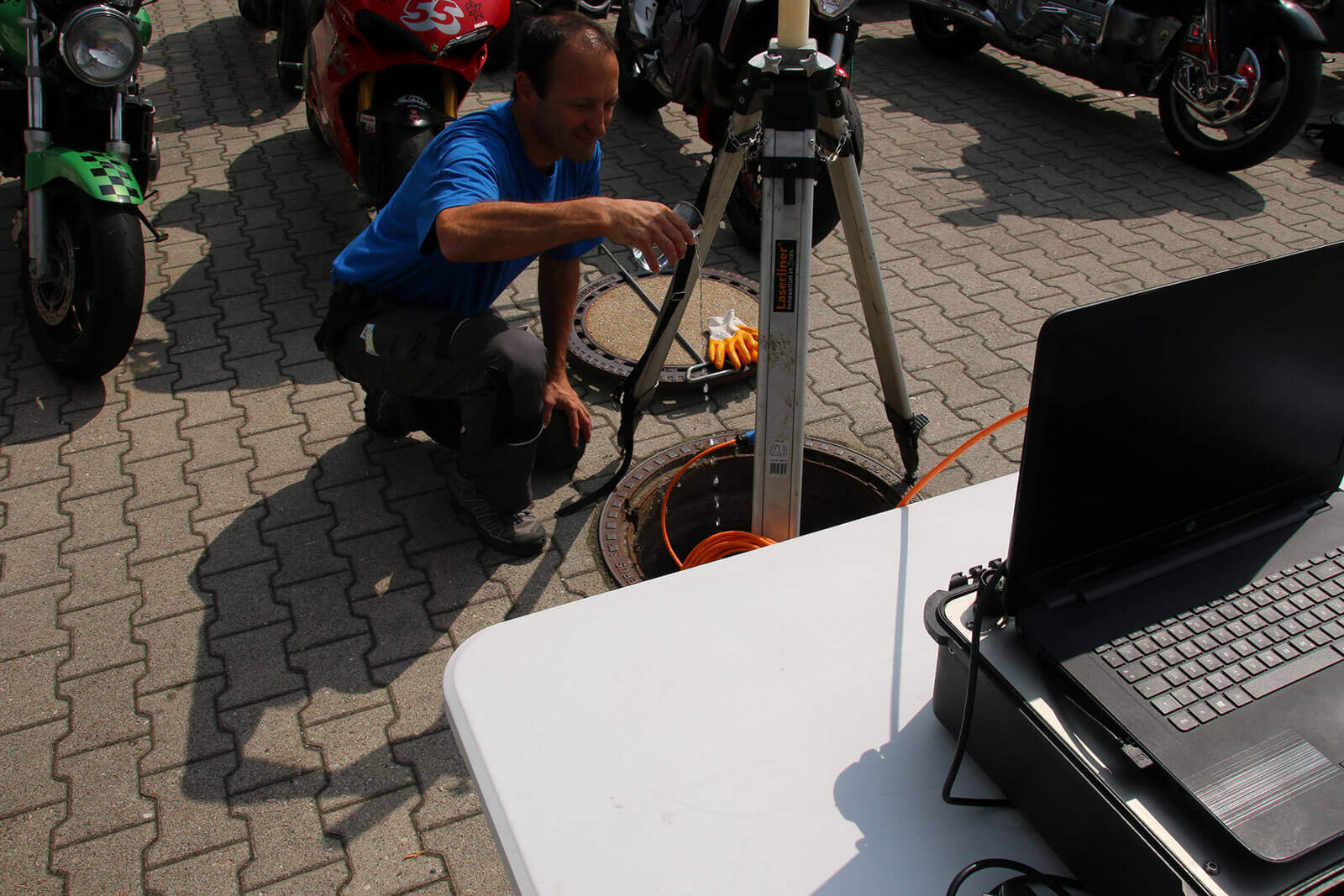 Einrichten der Messsonde am Schacht des mit Wasser gefüllten Leichtflüssigkeitsabscheider