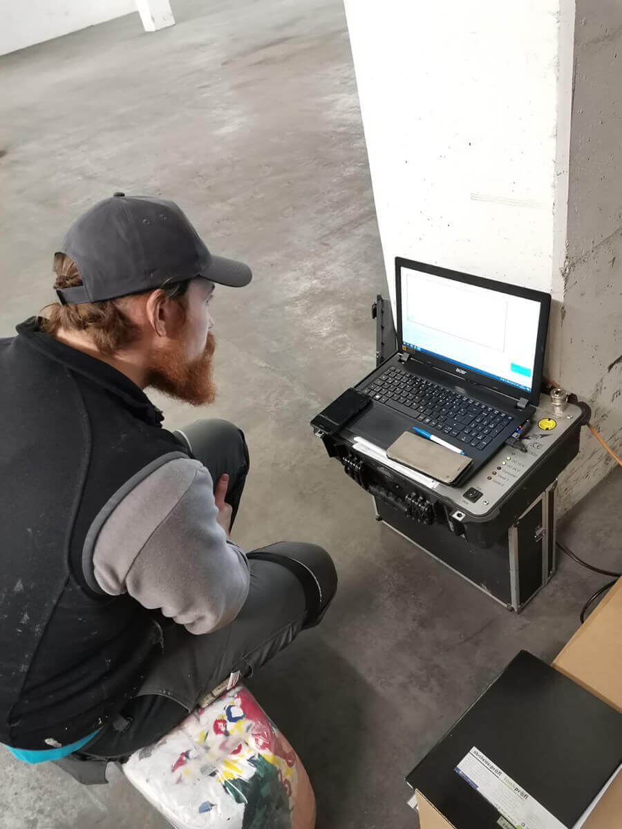 Monteur richtet Messequipment ein, legt den Prüfauftrag an und prüft die vorhandenen Dokumente