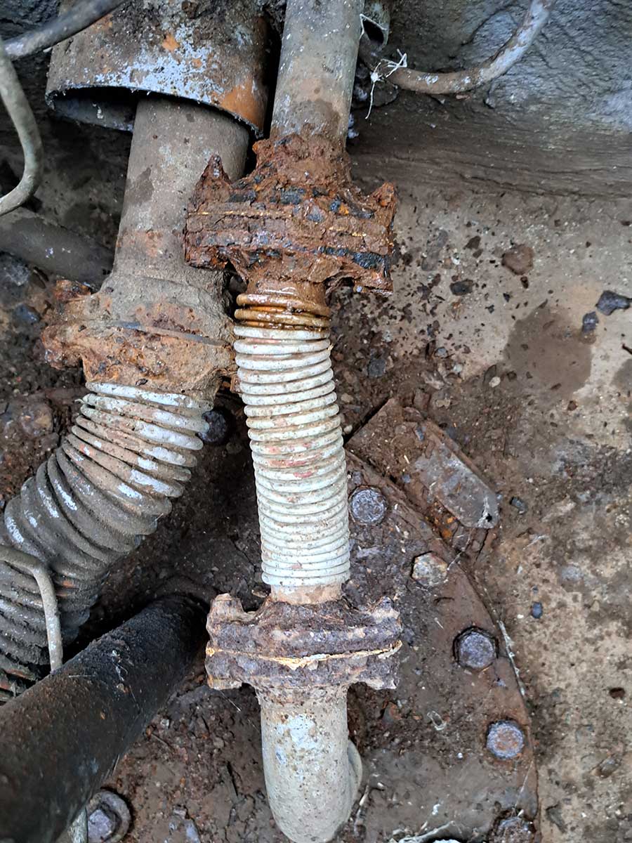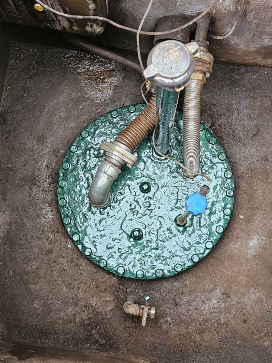 Bei fortgeschrittener Korrosion an ölführenden Leitungen (hier: Zulauf von Altöl aus der Werkstatthalle und der Entlüftungsleitung) kann ein Tausch dieser erforderlich werden. Im Zuge des Austauschs der flexiblen Wellrohre wird der Domdeckel entrostet und mit Korrosionsschutz behandelt.