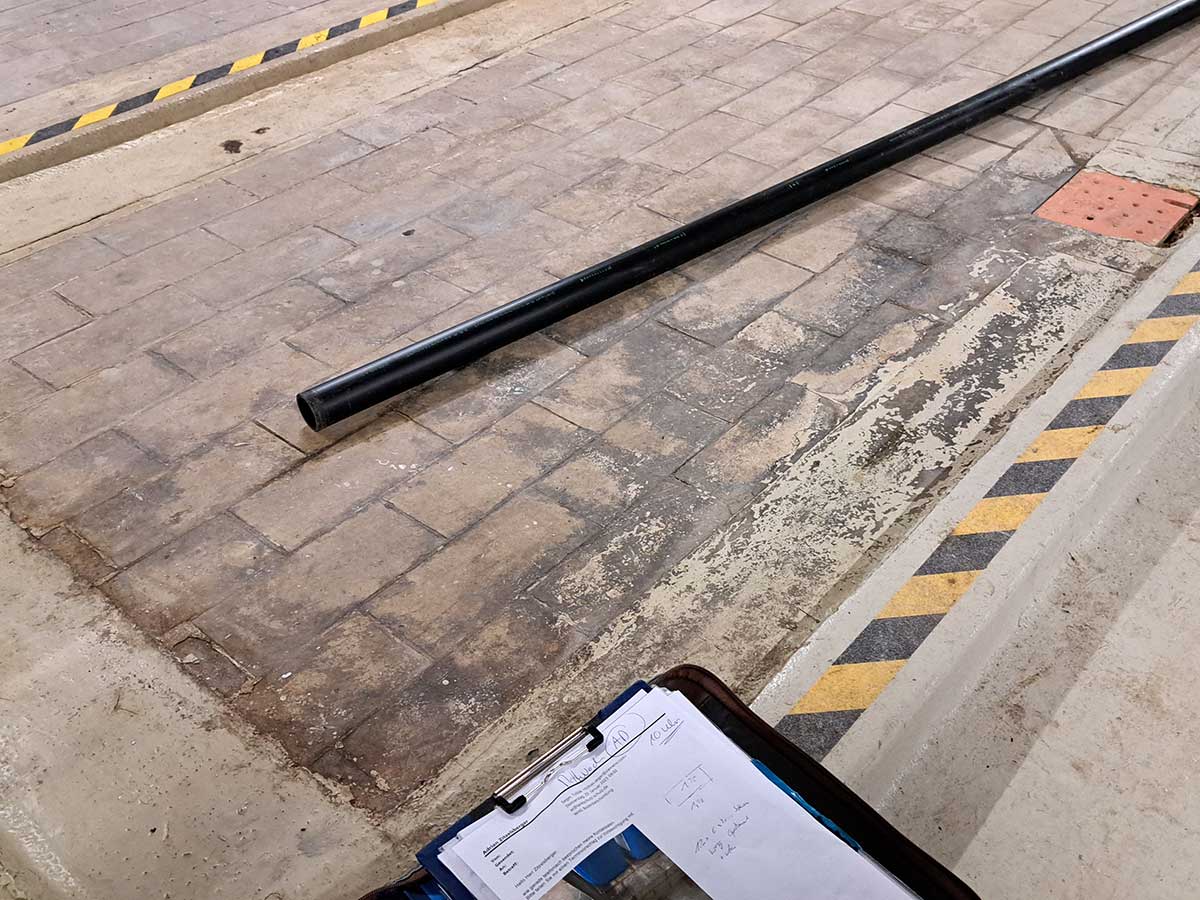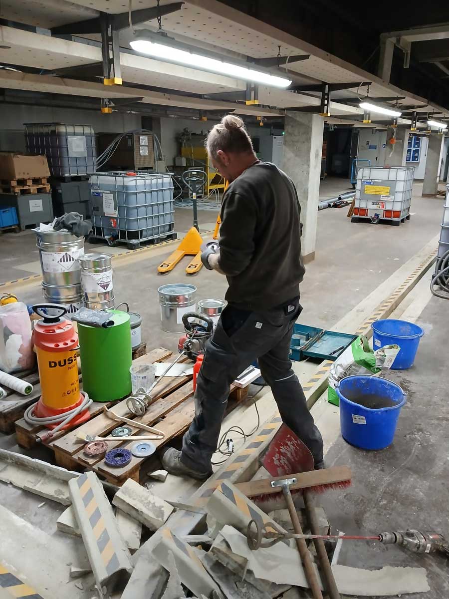 Durch Umstellung von Maschinen und Anlagen, die teilweise im Boden verankert waren können undichte Stellen, sprich Mängel an der WHG-Fläche entstehen. In nachfolgendem Beispiel änderten sich auch die Arbeitsabläufe im Unternehmen und die WHG-Wanne wurde neben den Reparaturen auch erweitert. Für die Reparatur, sowie für die Erweiterungen wird das Beschichtungssystem „Sto Cretec WHG System 1“ verwendet.