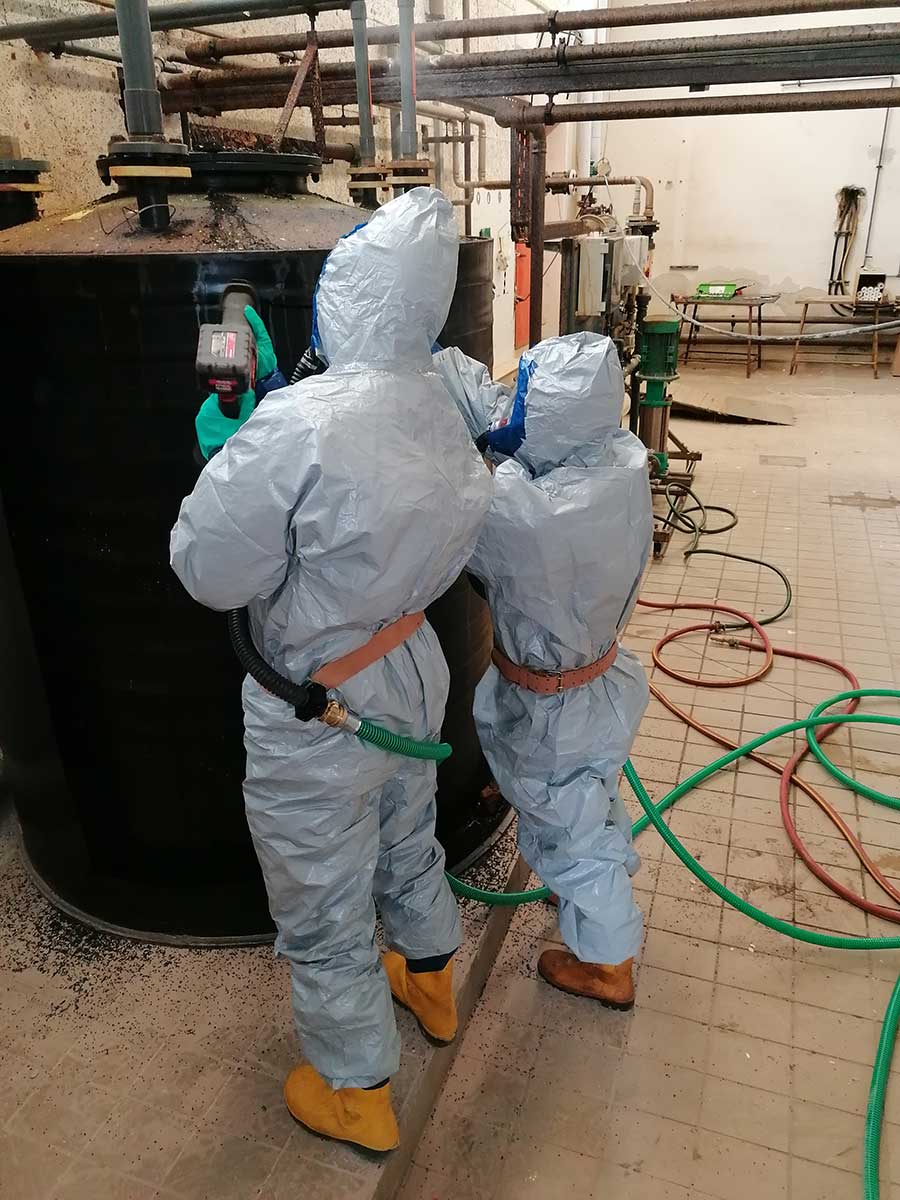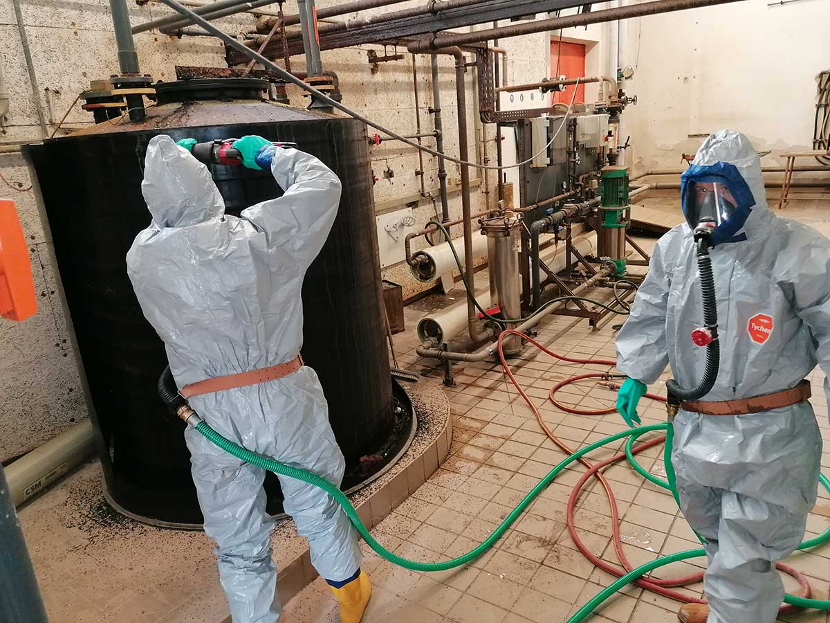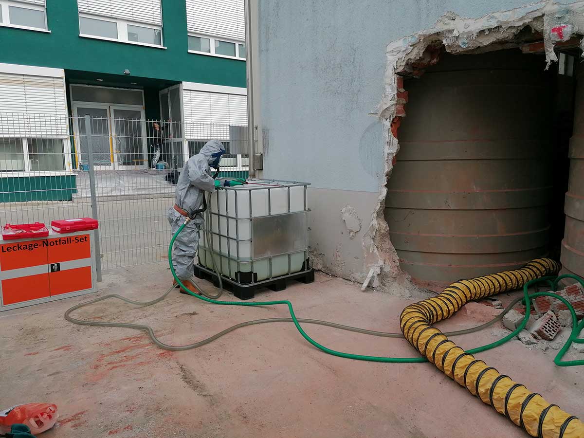 Bei der Stilllegung/Demontage von Tanks mit Gefahrstoffen (Säuren) ist insbesondere, wenn die Tanks/Anlagen in geschlossenen Räumen stehen, auf das Verdampfen des Mediums und mögliche Reaktionen des flüchtigen Mediums mit der Umgebungsluft zu achten. Schnell kann die Konzentration des Gefahrstoffs in der Luft für den Menschen zu hoch werden, bzw. es entstehen gesundheitsschädliche Dämpfe. Für das eingesetzte Personal sind dann die entsprechenden Maßnahmen zum Schutz der Gesundheit zu ergreifen. Bei vorliegender Konstellation werden die im Raum arbeitenden Monteure mit Schutzanzügen vor Hautkontakt mit der Säure und vor dem Einatmen der gefährlichen Dämpfe geschützt. Der Anzug enthält eine Gesichts- und Atemmaske, über die der Monteur permanent mit Frischluft von außen versorgt wird. Die Ausrüstung ist so konzipiert, dass im Schutzanzug stets ein minimaler Überdruck durch die Zufuhr von frischem und ölfreiem Sauerstoff ansteht und so ein Eindringen von Dämpfen im Gefahrbereich verhindert wird. Zur Minimierung der Schadstoffkonzentration im Gefahrbereich wird zudem für eine Belüftung & Entgasung des Arbeitsraums über Ventilatoren gesorgt.
