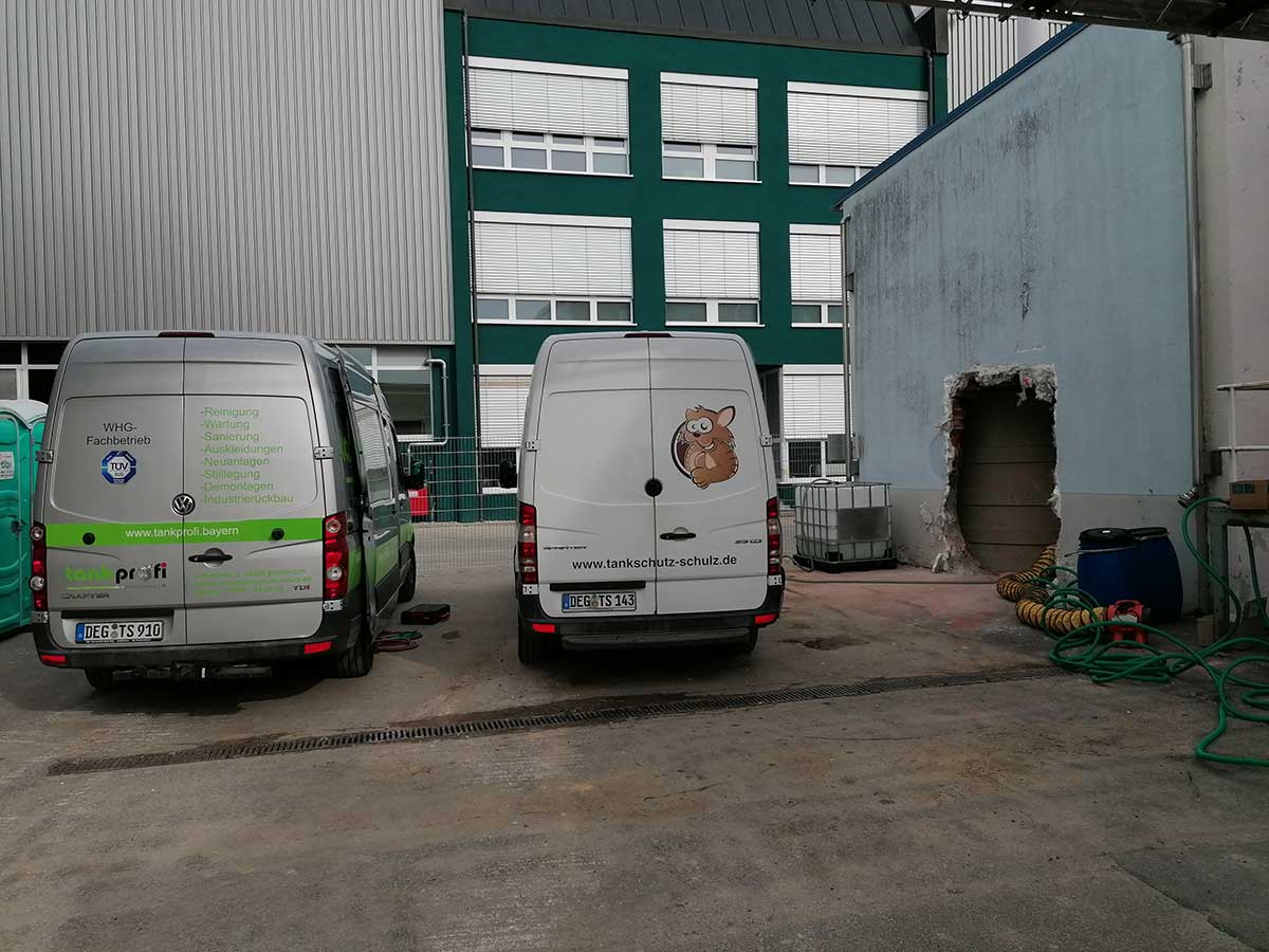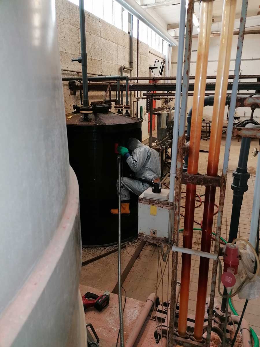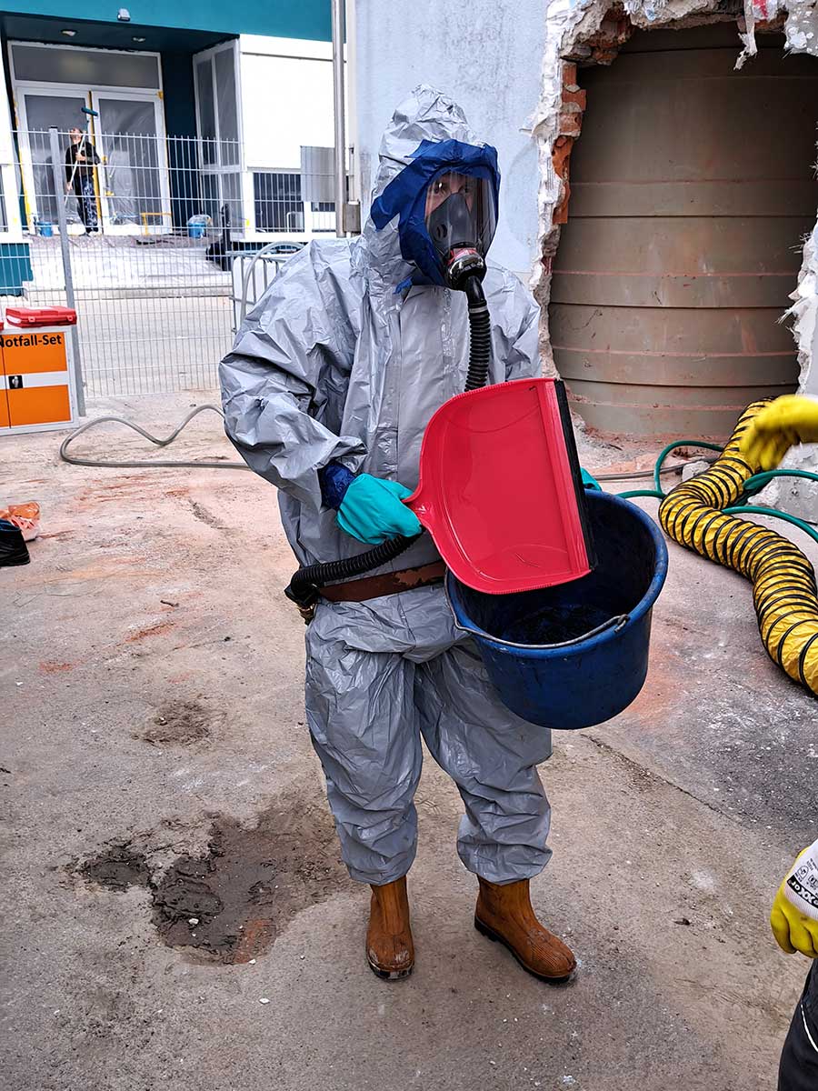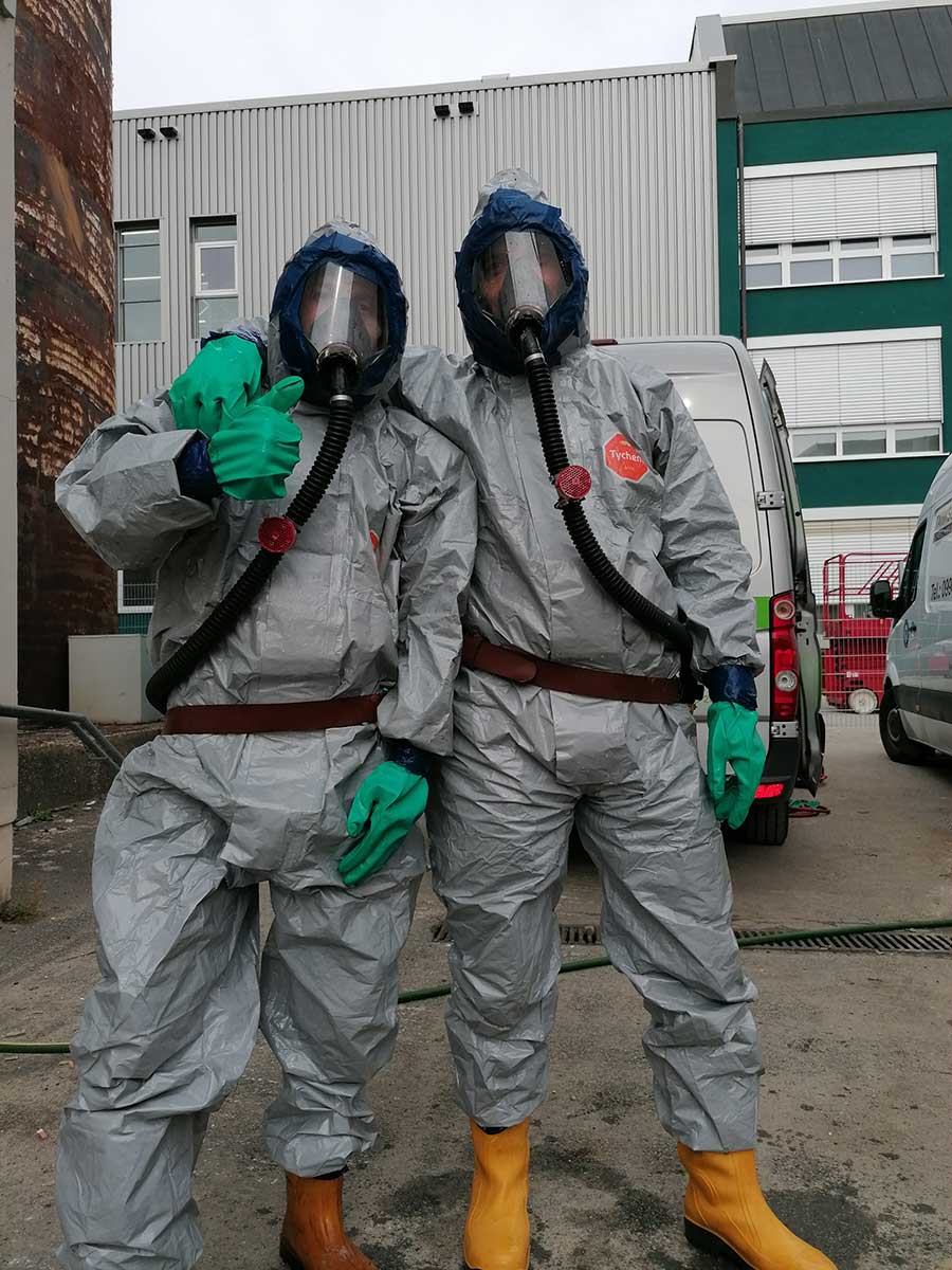 Bei der Stilllegung/Demontage von Tanks mit Gefahrstoffen (Säuren) ist insbesondere, wenn die Tanks/Anlagen in geschlossenen Räumen stehen, auf das Verdampfen des Mediums und mögliche Reaktionen des flüchtigen Mediums mit der Umgebungsluft zu achten. Schnell kann die Konzentration des Gefahrstoffs in der Luft für den Menschen zu hoch werden, bzw. es entstehen gesundheitsschädliche Dämpfe. Für das eingesetzte Personal sind dann die entsprechenden Maßnahmen zum Schutz der Gesundheit zu ergreifen. Bei vorliegender Konstellation werden die im Raum arbeitenden Monteure mit Schutzanzügen vor Hautkontakt mit der Säure und vor dem Einatmen der gefährlichen Dämpfe geschützt. Der Anzug enthält eine Gesichts- und Atemmaske, über die der Monteur permanent mit Frischluft von außen versorgt wird. Die Ausrüstung ist so konzipiert, dass im Schutzanzug stets ein minimaler Überdruck durch die Zufuhr von frischem und ölfreiem Sauerstoff ansteht und so ein Eindringen von Dämpfen im Gefahrbereich verhindert wird. Zur Minimierung der Schadstoffkonzentration im Gefahrbereich wird zudem für eine Belüftung & Entgasung des Arbeitsraums über Ventilatoren gesorgt.