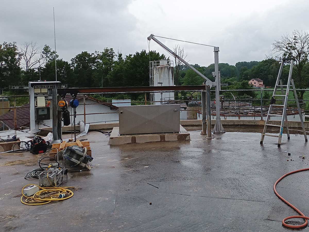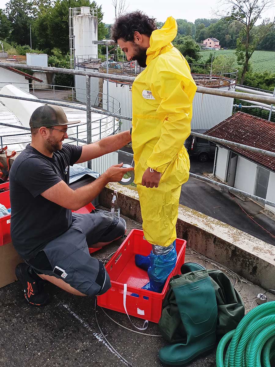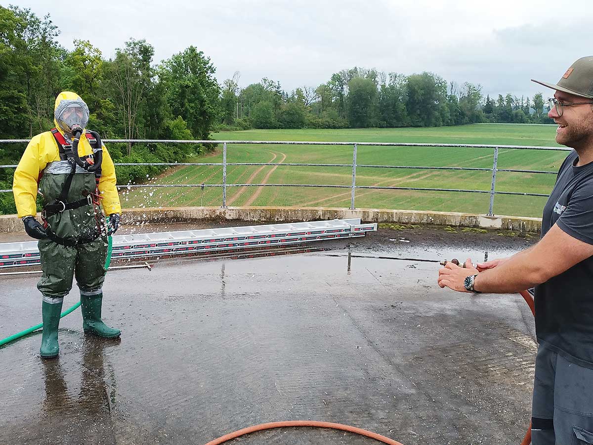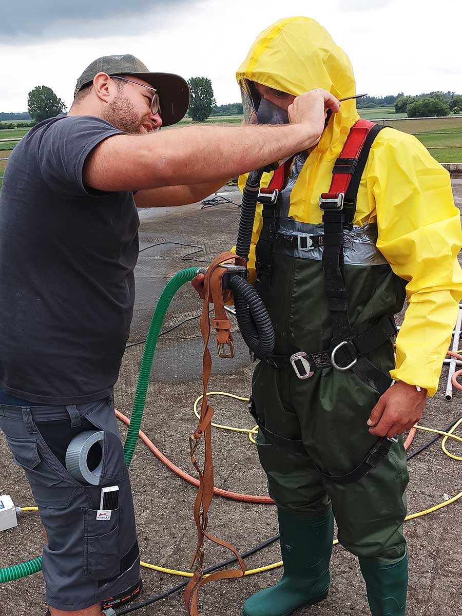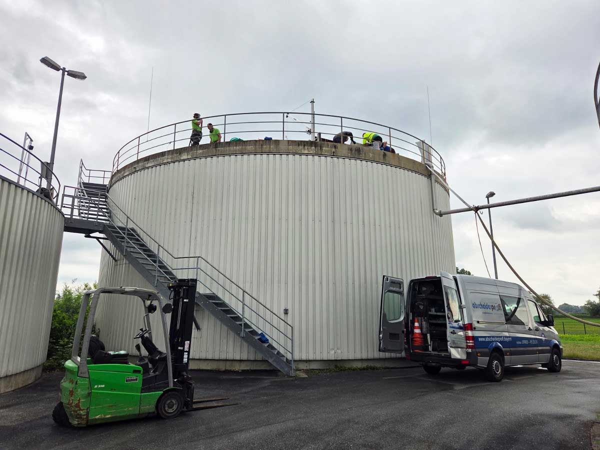 Durch einen Seilriss und Kabelbruch war eines der Puffer- und Klärbecken der industriellen Kläranlage ausgefallen. Der Propellermotor, welcher im Klärbecken für die Durchmischung von Prozesswasser mit den beizumengenden Zusätzen (Gefahrstoffe) lag am Boden des Klärbeckens, musste geborgen, die Halterung auf Schäden geprüft und ein neuer Propellermotor eingebracht werden. Der Behälter (mit 10 m Durchmesser und ca. 8 m Tiefe) wurde bis auf einen Füllstand von knapp einem Meter für den Einstieg des Monteurs restentleert. Aufgrund des reaktiven Gemisches im Behälter und der Höhe von 8 m ist der Monteur gegen Absturz sowie gegen Einatmen und Kontakt zu sichern.