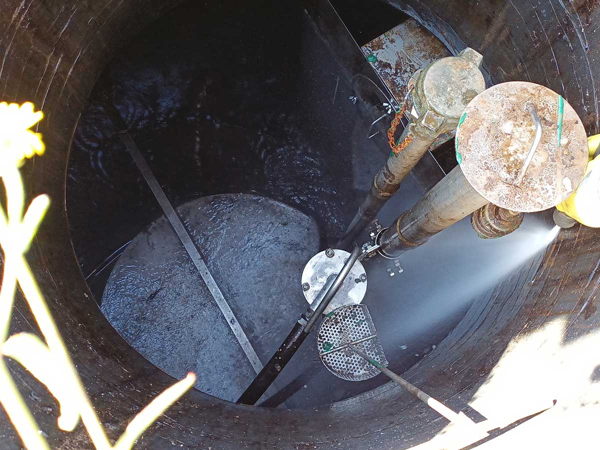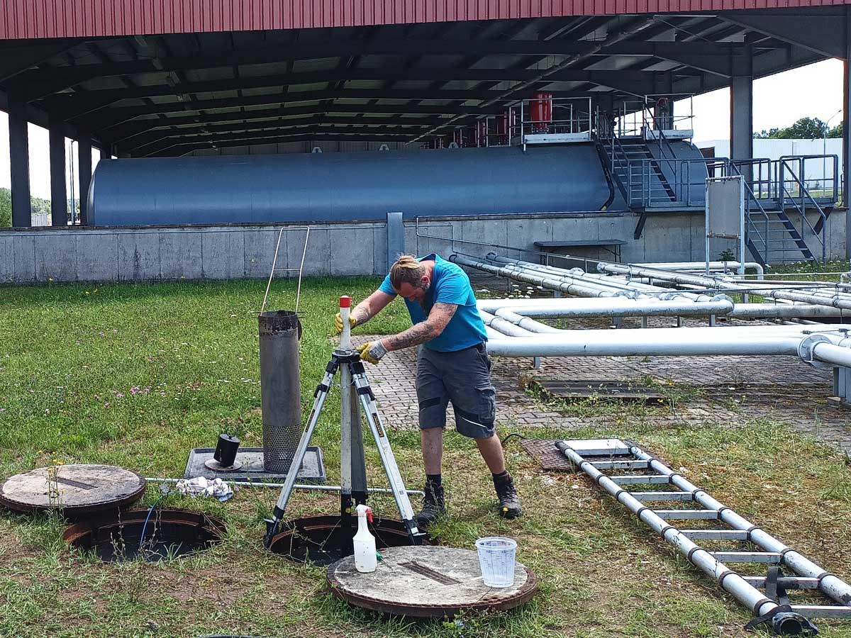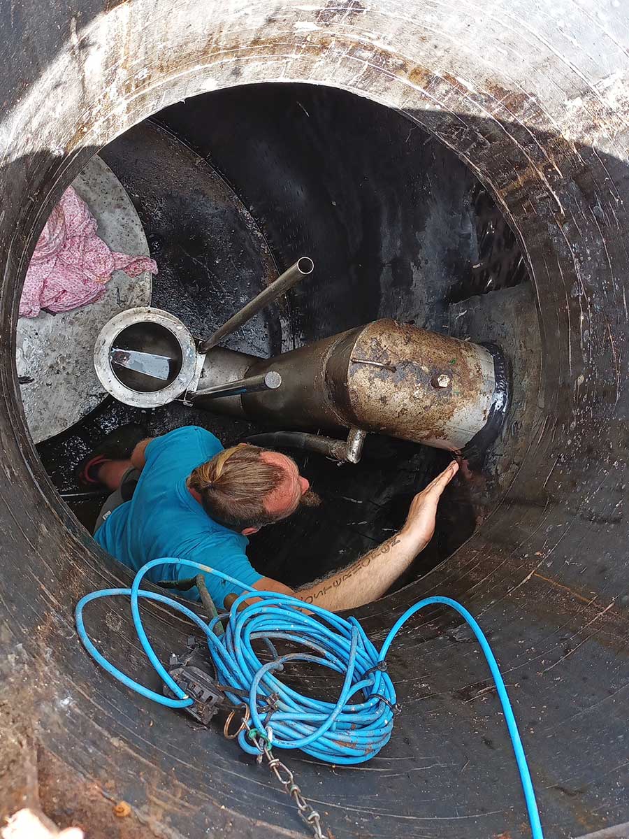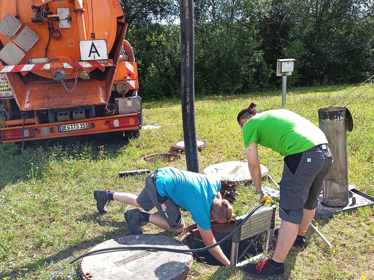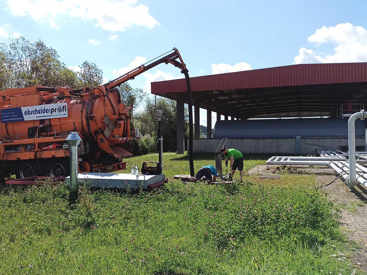 Monteure am Schacht des Ölabscheiders bei dessen Entleerung und Reinigung