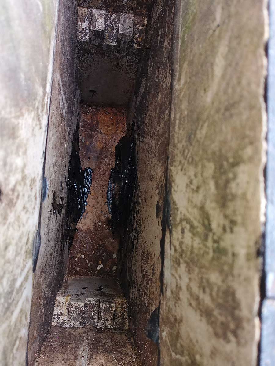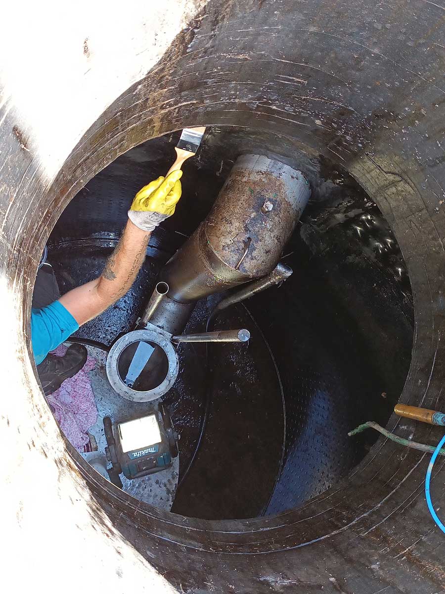 Hier waren an einer Tankstelle für Flugbenzin und Diesel Sanierungen am Auffangsystem (Rinnen) und im eigentlichen Behälter des Ölabscheiders erforderlich. An den Rinnen waren die Aufnahmen bzw. Übergänge zur Rohrleitung neu abzudichten. Im Abscheider selbst wurden Schwachstellen der Beschichtung (hier: Schweißstellen des Inliners) mit einem WHG-System abgedichtet, sowie der Übergang der Deckenplatte zum Abscheiderbehälter innen neu verfugt.
