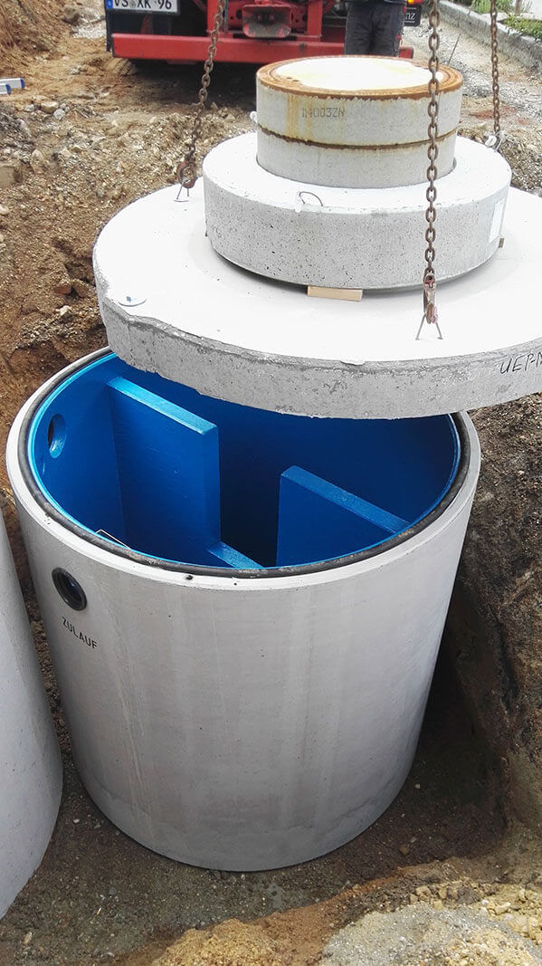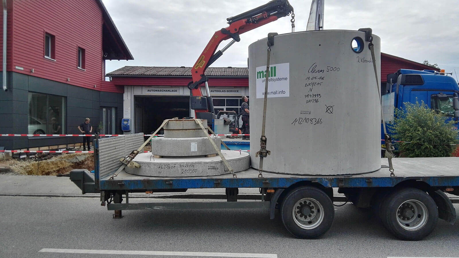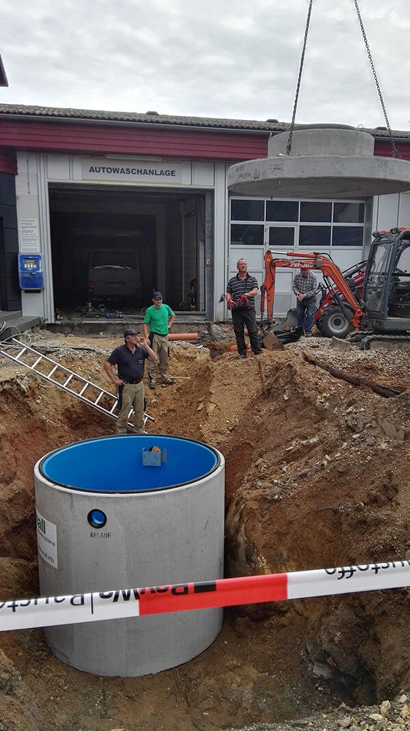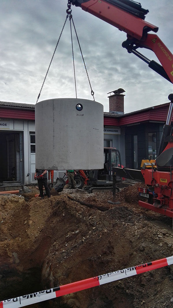 Hier: eine Werkstatt erhält einen neuen Ölabscheider. Entsprechend der vorhergehenden Berechnung der Nenngröße wird der Ölabscheider zum Wunschtermin angeliefert. Vorab werden die Bauarbeiten, wie Freiräumen und Absperren des Bereichs für den Abscheider und der Aushub der Baugrube entsprechend der Planvorgaben bis zum vereinbarten Liefertermin erledigt. Bei Anlieferung des neuen Abscheiders in Baugruppen wird dieser direkt in die Grube eingesetzt, sodass keine weiteren Wartezeiten entstehen. Nach Anschluss des Zu- und Ablaufs wird die Einbettung bzw. der Untergrund weiter verfestigt und der Untergrund für die spätere Teerdecke bzw. Pflaster vorbereitet.