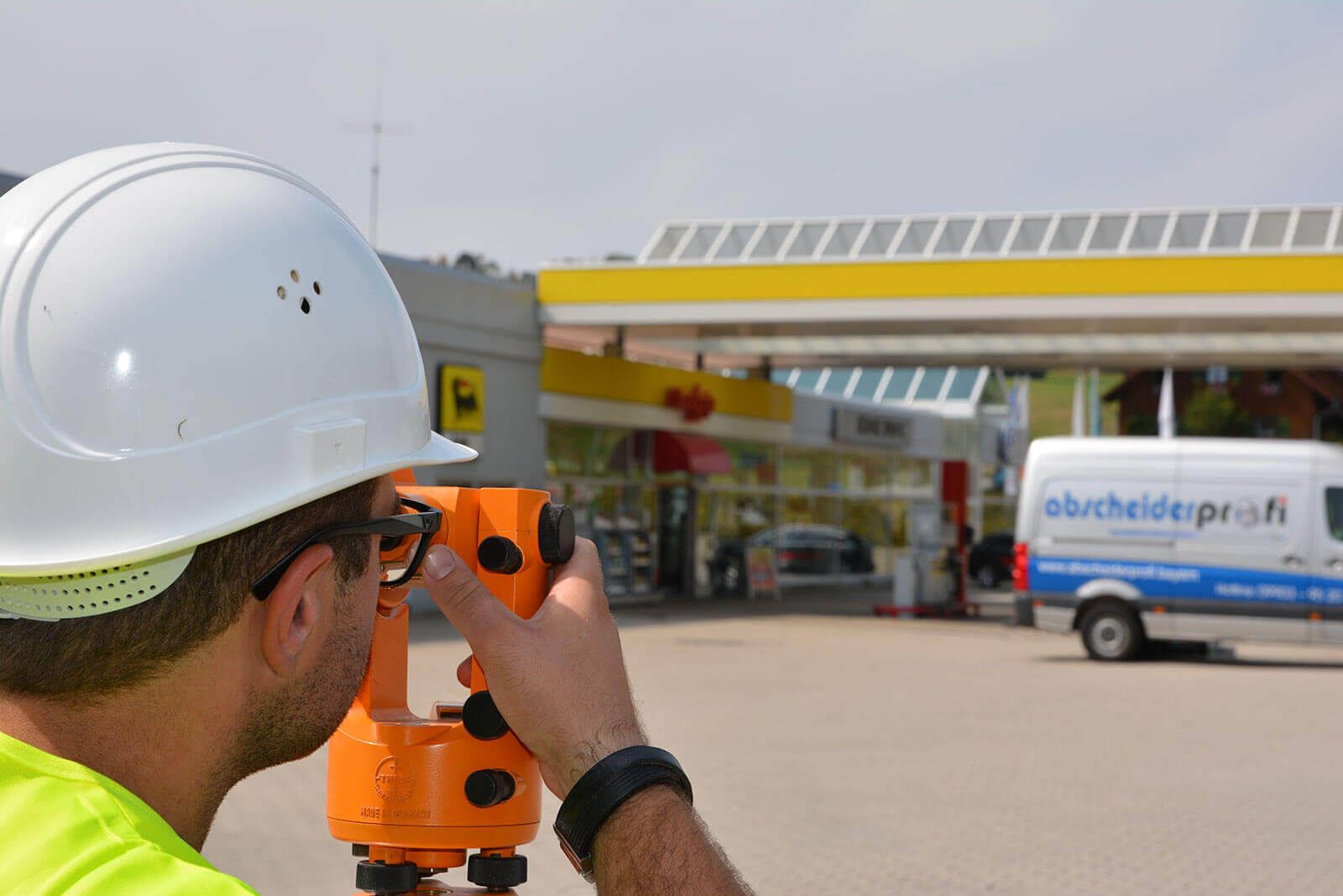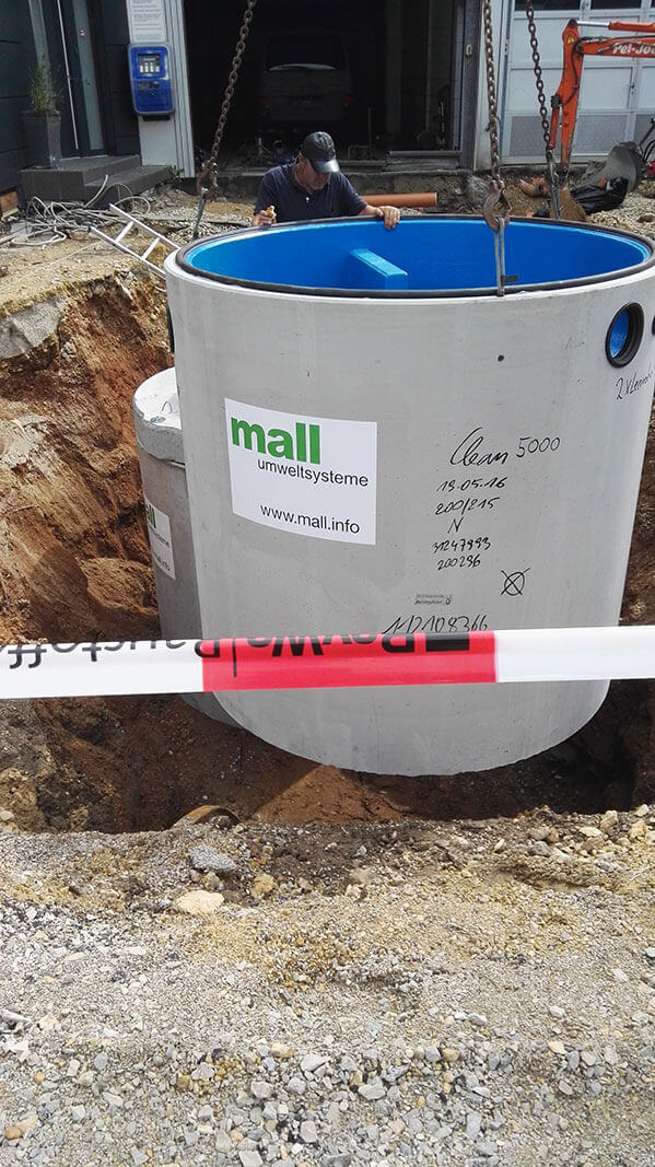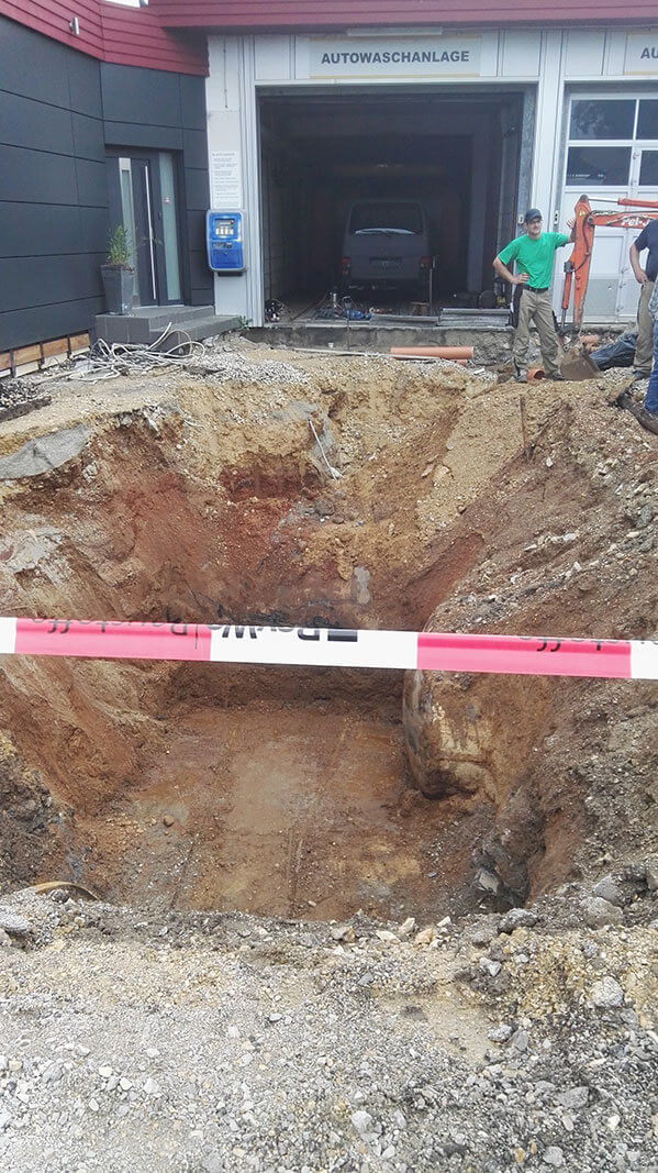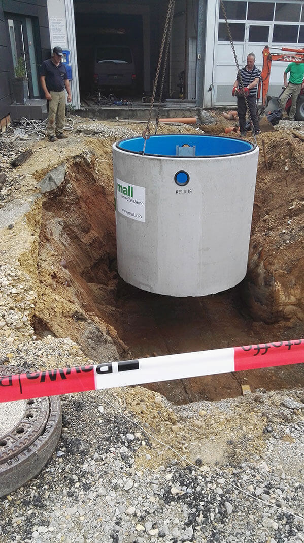 Hier: eine Werkstatt erhält einen neuen Ölabscheider. Entsprechend der vorhergehenden Berechnung der Nenngröße wird der Ölabscheider zum Wunschtermin angeliefert. Vorab werden die Bauarbeiten, wie Freiräumen und Absperren des Bereichs für den Abscheider und der Aushub der Baugrube entsprechend der Planvorgaben bis zum vereinbarten Liefertermin erledigt. Bei Anlieferung des neuen Abscheiders in Baugruppen wird dieser direkt in die Grube eingesetzt, sodass keine weiteren Wartezeiten entstehen. Nach Anschluss des Zu- und Ablaufs wird die Einbettung bzw. der Untergrund weiter verfestigt und der Untergrund für die spätere Teerdecke bzw. Pflaster vorbereitet.