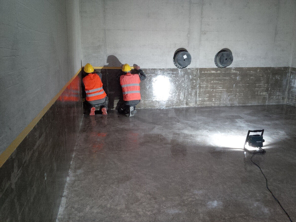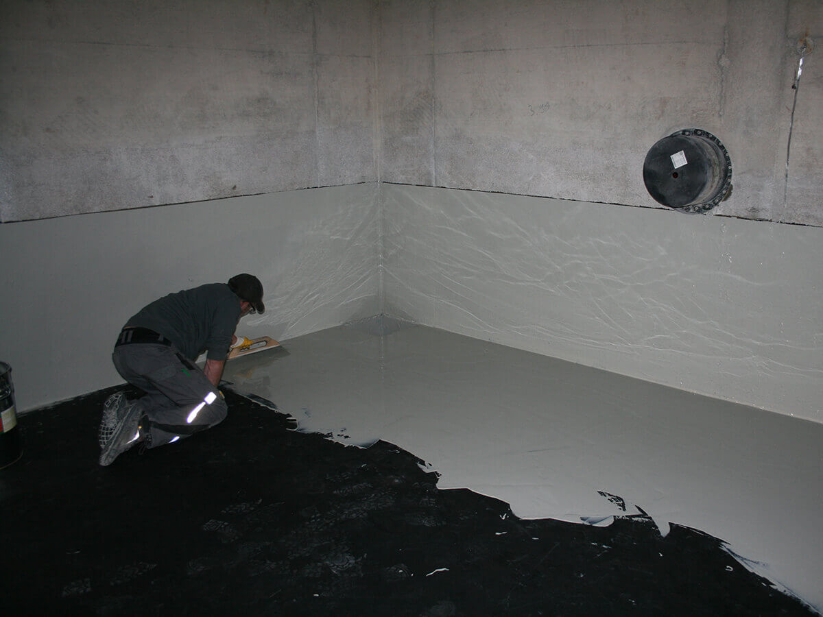 Aufbringen der WHG Grundschicht (mit Stellmittel) an den Seitenwänden der WHG-Wanne (1)