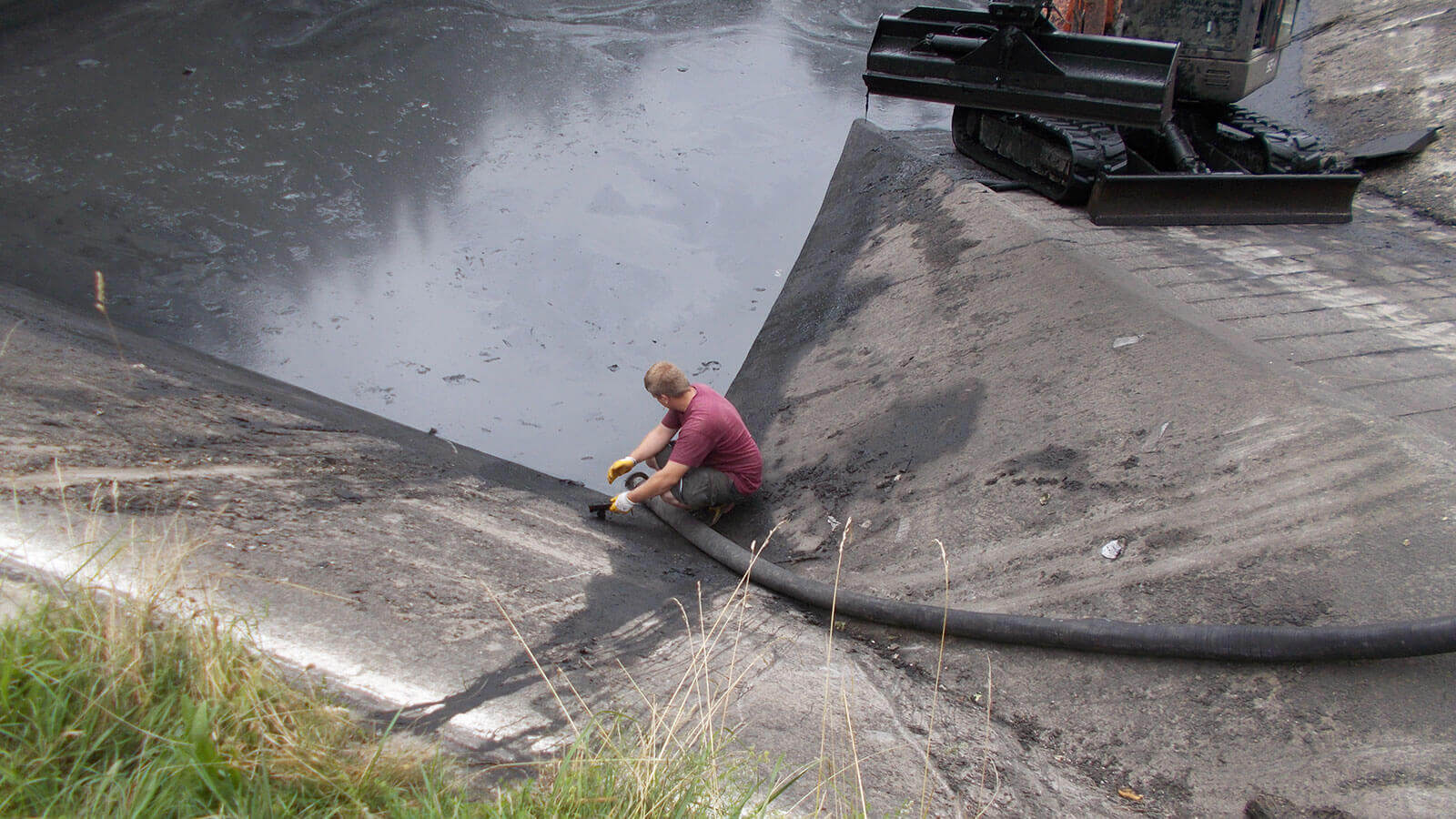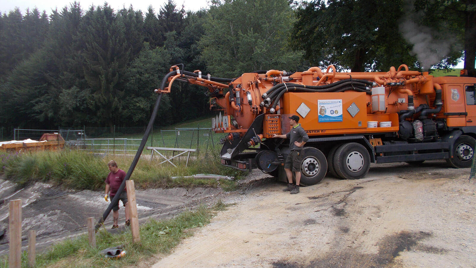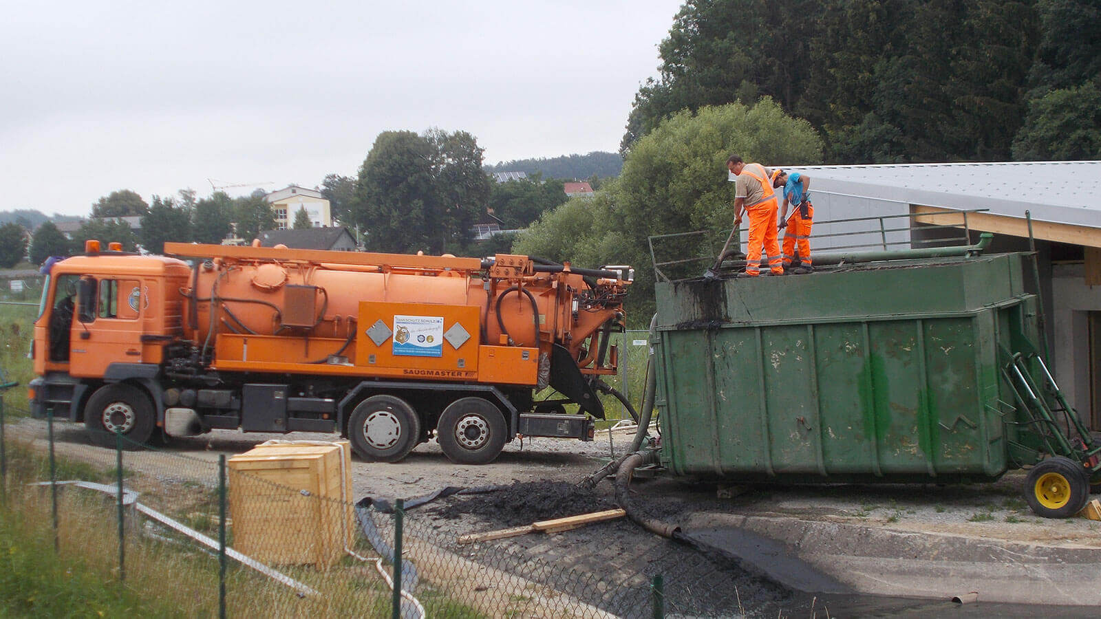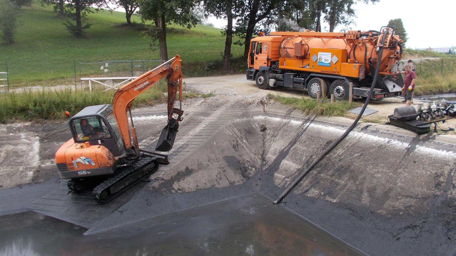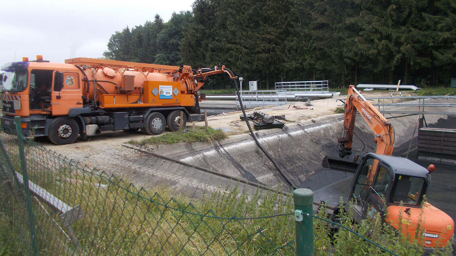 Hier: Einsatz bei einer umfangreicheren Umrüstung an einer Kläranlage. Leerung und Reinigung eines Beckens für die eigentlichen Sanierungsmaßnahmen und Filtration des Abwassers über eine mobile Filtrationsanlage.