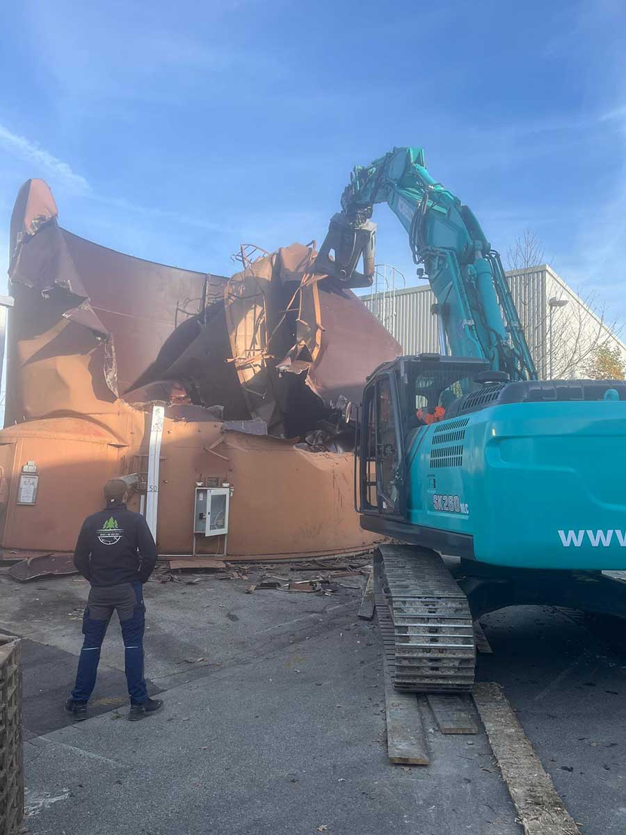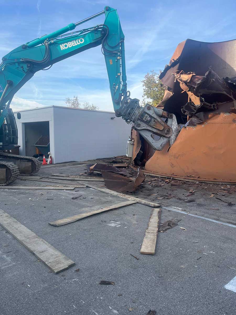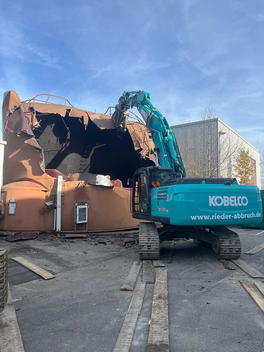 Rückbau eines 350 m³ Flachbodentanks aus Stahl und fachgerechte Entsorgung. Vor dem Rückbau bzw. der Demontage wird der Heizöltank entleert und gereinigt. Die Reststoffe wie Ölschlamm und verwendete Reinigungshilfsmittel werden in zugelassenen Gebinden gesammelt und der fachgerechten Entsorgung zugeführt. Der Kunde erhält die entsprechenden Nachweise und Entsorgungsbelege. Nach der Entgasung und Belüftung des Tanks erfolgt die Freimessung und Ausstellung des Befahrscheins, erst dann dürfen die Monteure für die Innenreinigung einsteigen und Ihre Arbeiten für eine Stilllegung vornehmen. Nach der fachgerechten Stilllegung kann mit der Demontage der Tankteile begonnen werden. In vorliegendem Fall konnte die Demontage durch den Einsatz des Baggers mit schwerem Gerät in sehr kurzer Zeit durchgeführt werden.